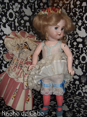 Esta es una muñequita que encontre por casualidad, en una tienda del rastro de Madrid, cuando la vi estaba la pobre, en un estado deprorable, sobre todo el cuerpo, pero enseguida de examinarla, y a pesar de la suciedad que tenia su cara, le vi un enorme potencial, su bellisima carita, y que la porcelana estaba perfecta, ademas le acompañaban unos preciosos ojos azul oscuro, y aunque la firma, es de un fafricante no muy conocido, que siempre firma sus muñecas con una simple B, en inciso, es decir que abulta sobre la superficie de la porcelana, y unos numeros que corresponden con la talla, de la pieza, unos 36cm. El cuerpo es de pasta de madera recubierto de duco, este es el que se desprendia a trozos, y faltaba en muchas de las partes del cuerpo. Se lo he lijado por completamente, luego lo he empastado, limado y pintado en el mismo tono de la cara. Le he puesto una peluca de moharé y realizado, la ropa interior y exterior con telas y generos antiguos, y los zapatos de piel.
